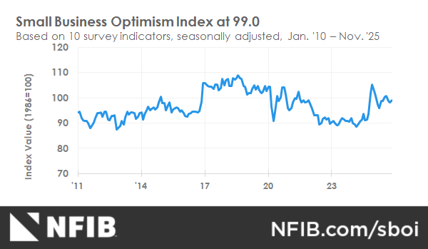 The NFIB Research Foundation has collected Small Business Economic Trends data with quarterly surveys since the 4th quarter of 1973 and monthly surveys since 1986. Survey respondents are drawn from NFIB’s membership. The report is released on the second Tuesday of each month. This survey was conducted in November 2025.