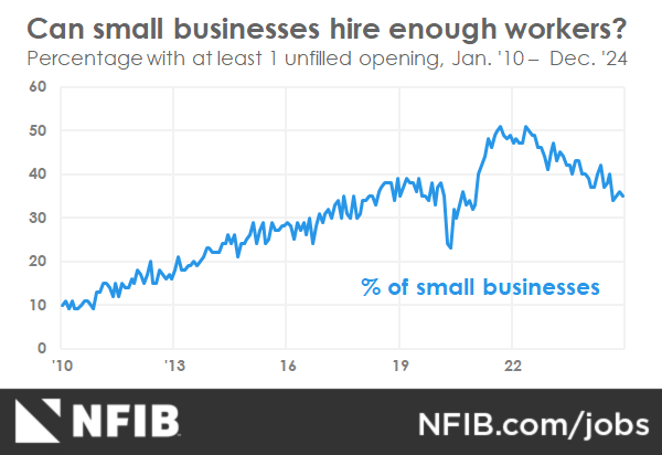 As reported in NFIB’s monthly jobs report, a seasonally adjusted 35% of all small business owners reported job openings they could not fill in December, down one point from November. Of the 55% of owners hiring or trying to hire in December, 89% reported few or no qualified applicants for the positions they were trying to fill.