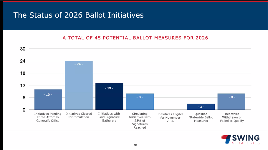 Last Tuesday (January 27), Swing Strategies’ Tom Ross and Tino Rossi gave a presentation on the initiatives competing for placement on the 2026 General Election ballot. Highlights from their remarks and slides included: