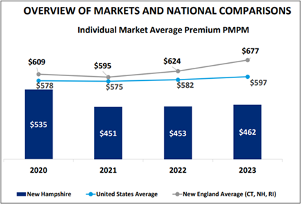 New Hampshire: Closer to home, New Hampshire has seen even greater success with its Individual Market reinsurance program. Launched in 2021, reinsurance helped lower the average individual market premium from a high of $613 per month in 2018 to $462 per month in 2023 (-25%).