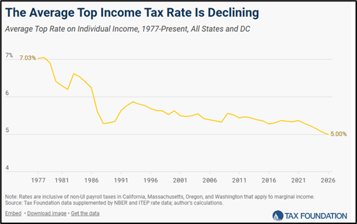The Tax Foundation finds the average top income tax rate at the state level fell from 7.03% in 1977 to 5% in 2026.
